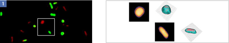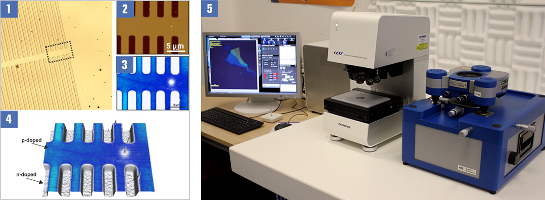 The example shows an overview 3D profile of doped (p, n) semiconductor structure [1] acquired by LEXT. Corresponding AFM topography [2] and EFM image [3] of the marked region in (a). [4] Overlay of 3D AFM topography and EFM . For details see the product note.