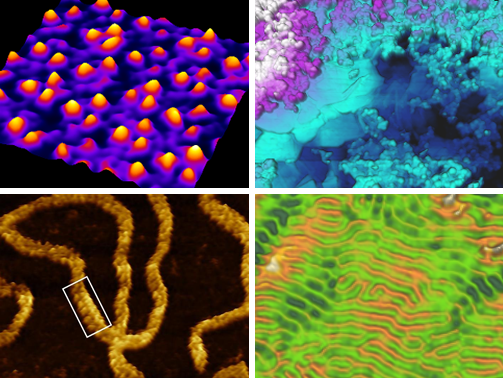QI™ is perfect for quantifying biological and chemical interactions, for nano-mechanical studies of polymers or advanced materials, and can be combined with high performance conductive AFM, EFM and KPM. The examples show bacteriorhodopsin at different interaction forces, CAFM on a battery electrode, major and minor grooves of DNA and mapping of a block co-polymer (click on the images for details).